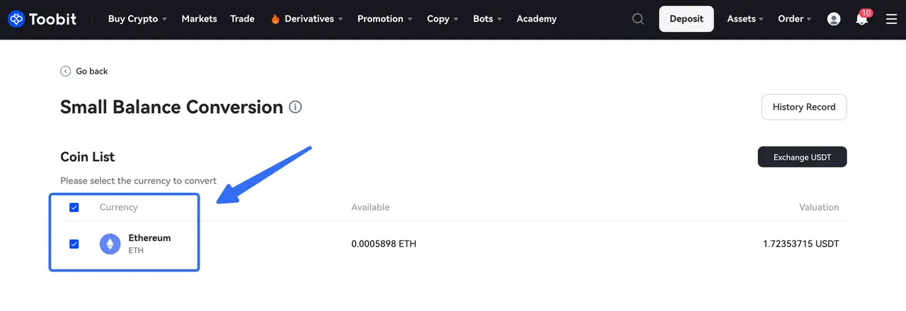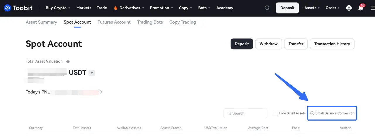 • در صفحه دارایی‌ها، به پایین صفحه بروید یا به دنبال گزینه‌ای با عنوان Small Balance Conversion بگردید.