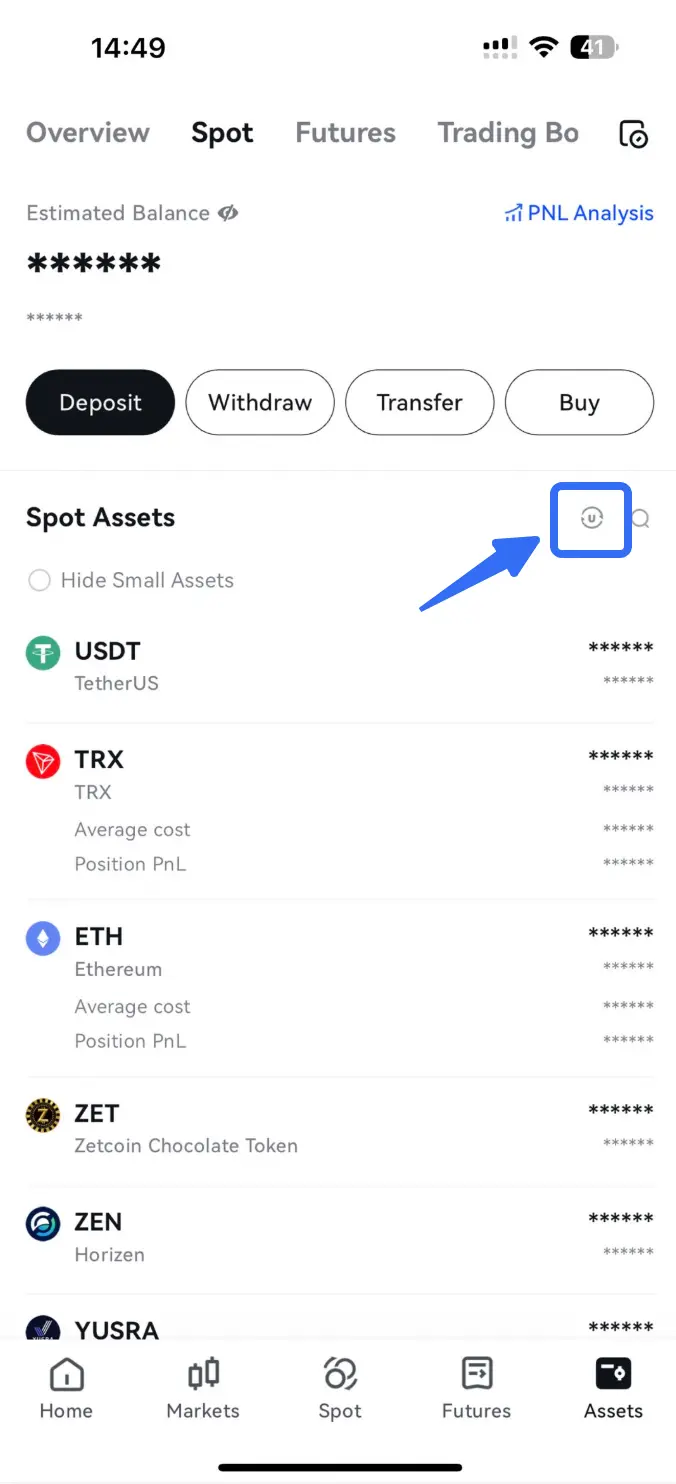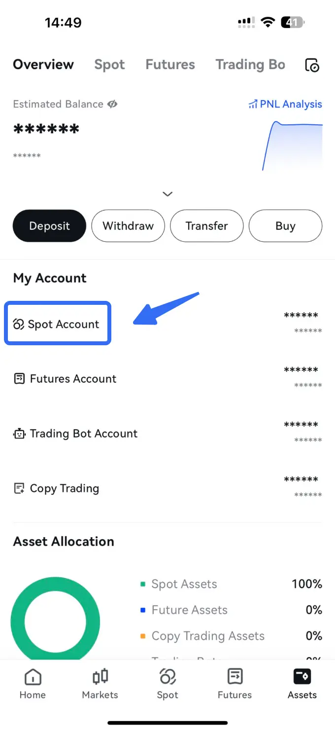 • از منوی کشویی، Spot Account را انتخاب نمایید تا فهرست کامل دارایی‌های شما نمایش داده شود.