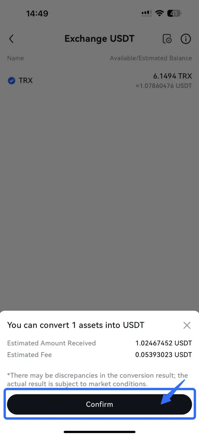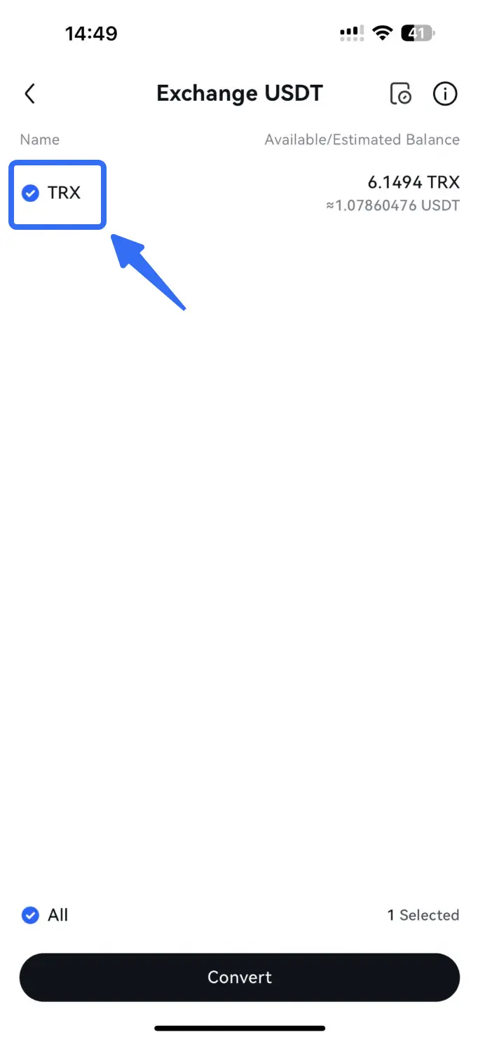 • دارایی‌هایی را که می‌خواهید به USDT تبدیل کنید، علامت بزنید.