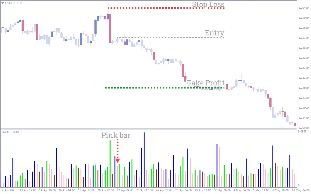 - تشکیل ستون صورتی: مشابه با استراتژی خرید، باید منتظر بمانید تا ستون صورتی روی نمودار شکل بگیرد.