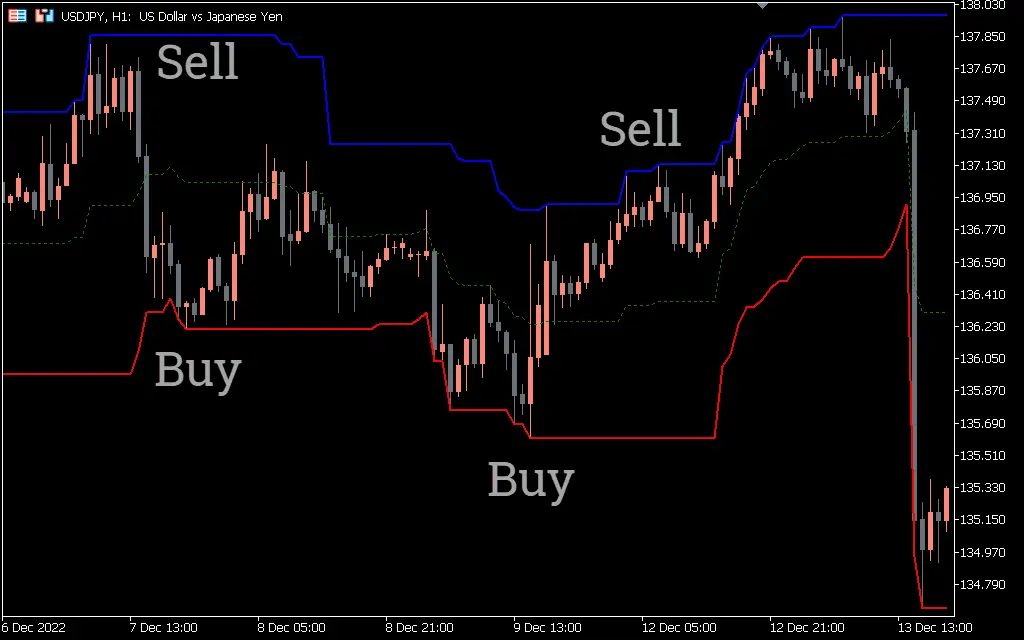 در نمودار H1 جفت ارز USD/JPY که به عنوان مثال آمده است، میتوان سیگنالهای خرید و فروش را با استفاده از اندیکاتور VR Donchian شناسایی کرد: