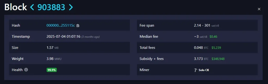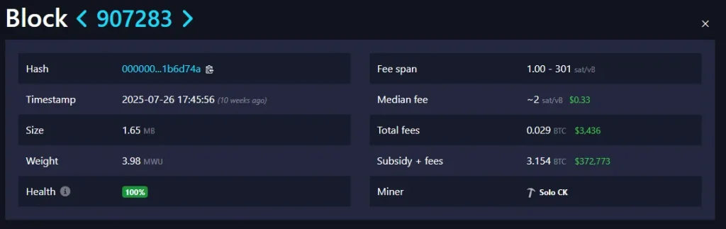 ماینر دیگری، با استفاده از سرویس Solo CKPool، موفق شد بلوک ۹۰۷,۲۸۳ را استخراج کند و پاداش ۳.۱۲۵ بیتکوین (حدود ۳۷۲,۷۷۳ دلار) دریافت کند. این بلوک شامل ۴,۰۳۸ تراکنش بود و ۳,۴۳۶ دلار کارمزد تراکنش نیز به همراه داشت.