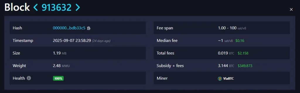 در ۸ سپتامبر ۲۰۲۵، یک ماینر سولو بلوک ۹۱۳,۶۳۲ را استخراج کرد و جایزهای معادل ۳.۱۴ بیتکوین دریافت نمود که در آن زمان ۳۴۸,۱۱۱ دلار ارزش داشت. این پاداش شامل ۳.۱۲۵ بیتکوین استاندارد و ۰.۰۱۹ بیتکوین کارمزد تراکنشها بود. این بلوک شامل ۱,۹۵۶ تراکنش بود.