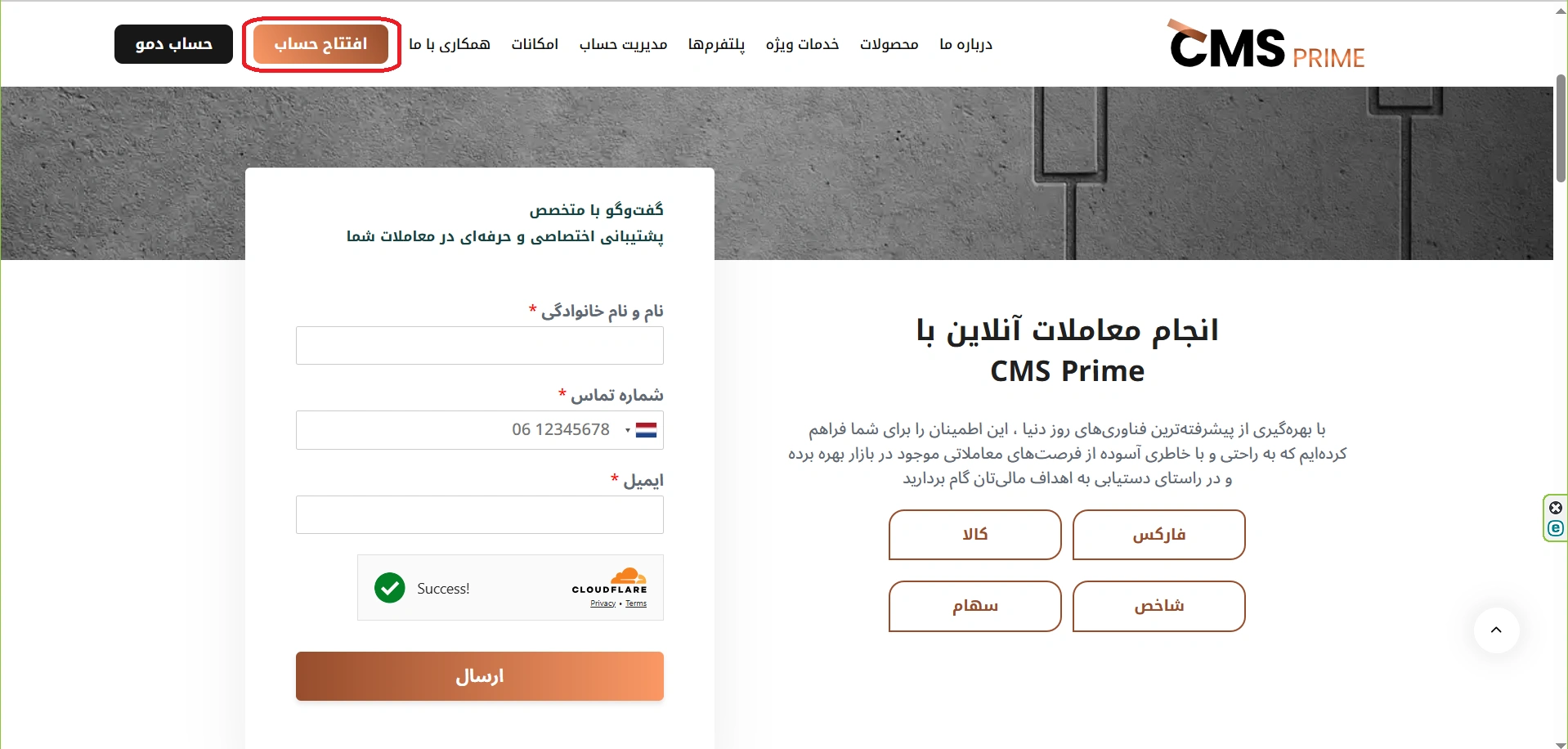 ابتدا وارد وبسایت CMS PRIME شوید و سپس گزینه افتتاح حساب را انتخاب کنید.
