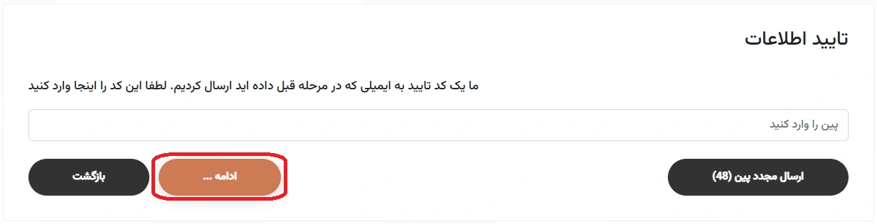 سپس کد ارسال شده به ایمیل خود را در فیلد زیر وارد کنید و گزینه “ادامه” را انتخاب کنید.