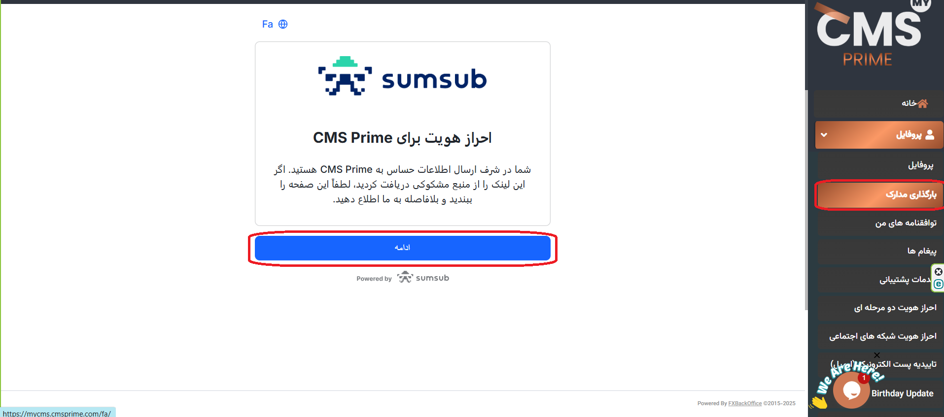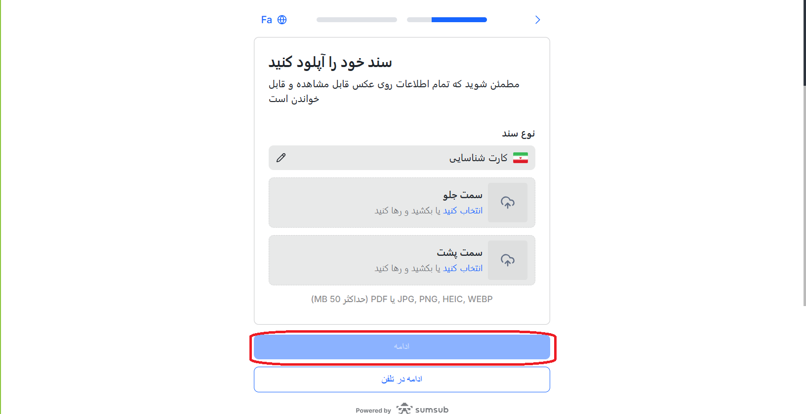 ابتدا گزینه بارگزاری مدارک را انتخاب کرده و مطابق تصویر زیر گزینه ادامه را انتخاب کنید.