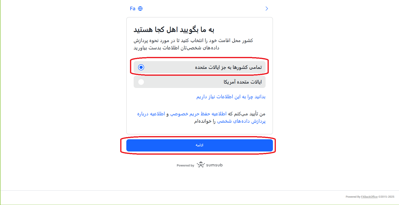 با توجه به اینکه در ایران هستیم، گزینه تمامی کشورها بجز ایالات متحده را انتخاب کرده و سپس گزینه ادامه را انتخاب میکنیم.