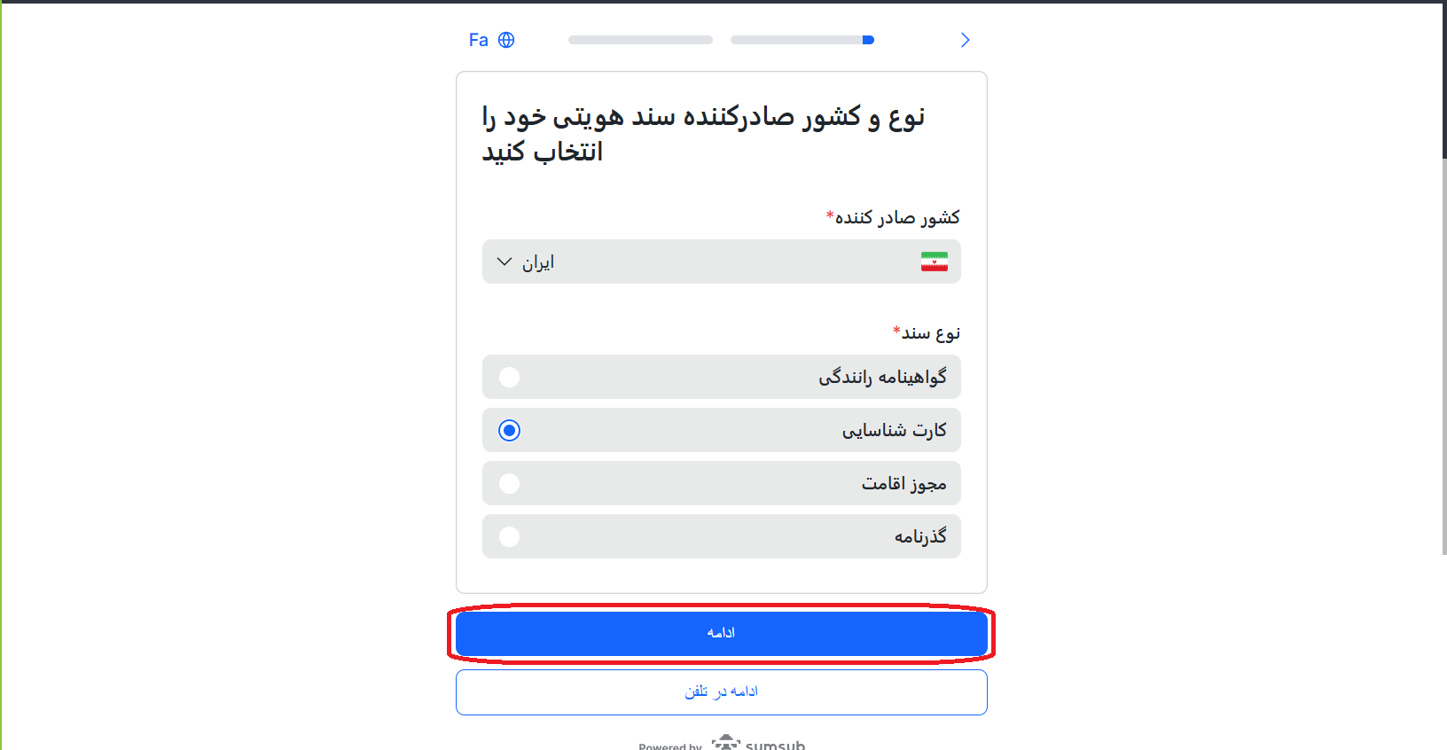در مرحله بعد ابتدا کشور خود را انتخاب کنید و سپس با توجه به نوع مدرکی که میخواهید با آن احراز هویت کنید، یکی از گزینه ها را انتخاب کرده و روی گزینه ادامه کلیک کنید.